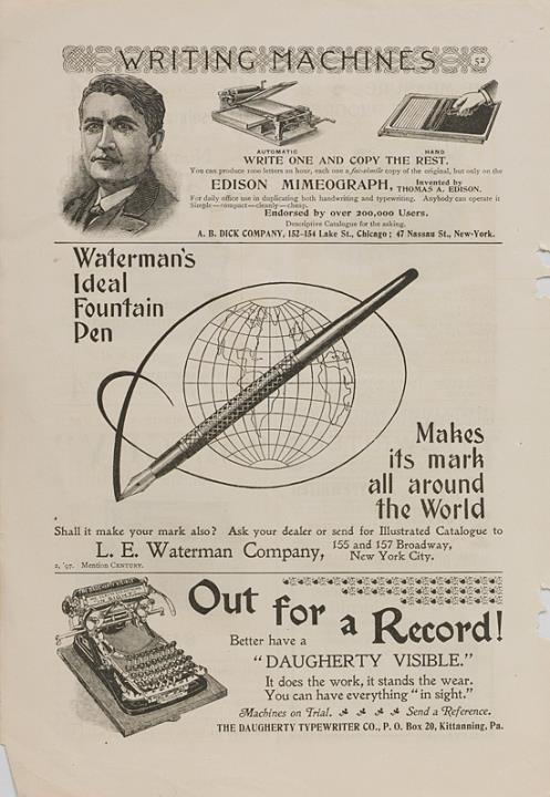 zwei Zeitschriftenblätter mit Werbeanzeigen für Schreibmaschine Caligraph 4, Daugherty Visible, Columbia Bar-Lock, Remington 6, Densmore, Smith Premier 2 und Kopiergerät Edison Mimeograph monochrom Jahreszahl handschriftlich vermerkt