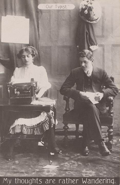Illustrierte Postkarte; Fotografie, monochrom Rückseite: Vorgesetzter/Mitarbeiter und Sekretärin mit Schreibmaschine in romantischer Büroszene, Text: My thoughts are rather Wandering Vorderseite nicht beschrieben