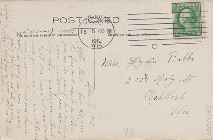 Illustrierte Postkarte; Fotografie, monochrom; Serie A.B.R. Rückseite: Vorgesetzter und Sekretärin in romantischer Büroszene, Tisch mit Schreibmaschine Vorderseite: beschrieben; adressiert an Miss Babler, Oshkosh; Briefmarke U.S. Postage 1 Cent; Poststempel Oshkosh/18 5 1912