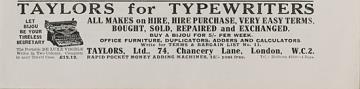 Zeitschriftenblatt mit Werbeanzeige für Schreibmaschinenhandlung Taylors Ltd, London monochrom