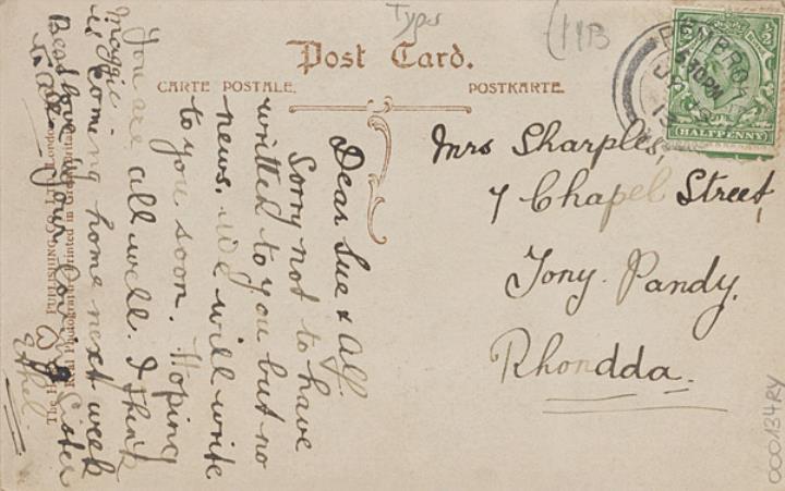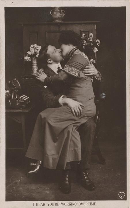 Illustrierte Postkarte; Fotografie, monochrom; Serie Heart 311S Rückseite: Vorgesetzter/Mitarbeiter und Sekretärin in romantischer Büroszene, Tisch mit Schreibmaschine Vorderseite: beschrieben; adressiert an Mrs. Sharles, Rhondda; Briefmarke Postage Revenue (U.K.) Half Penny; Poststempel Pembroke/Jy 19 1913