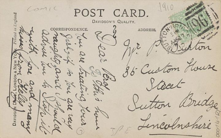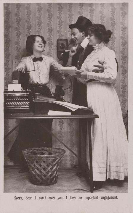 Illustrierte Postkarte; Fotografie, monochrom Rückseite: Büroszene; zwei Sekretärinnen und Vorgesetzter beim Telefonieren Vorderseite: beschrieben; adressiert an Mr. Burton, Lincolnshire; Briefmarke Postage Revenue (U.K.) Half Penny; Poststempel Sutton Bridge/Au 27 1910