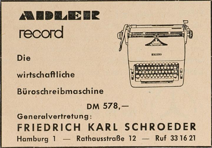 Werbeanzeige für Schreibmaschine Adler Record monochrom
