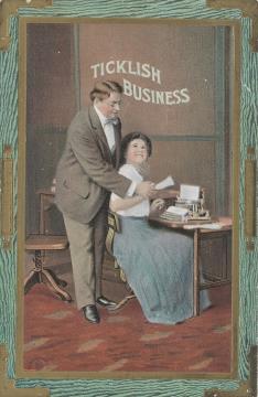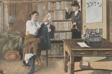 Illustrierte Postkarte; Grafik, polychrom; Nr. 602 copyright 1907 J. Murray Jordan Rückseite: Büroszene; Sekretärin auf Schoß des Vorgesetzten sitzend, Ehefrau betritt das Büro Vorderseite nicht beschrieben