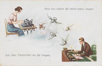 Illustrierte Postkarte; Grafik, polychrom; Serie Ws+sB Nr. 6738/1 Rückseite: Frau mit Schreibmaschine, Mann mit Brief, dazwischen Tauben als Briefboten; weiterer Text: Soll dies Täubchen zu dir tragen Vorderseite: beschrieben; datiert Chemnitz, am 30. Aug. 1922
