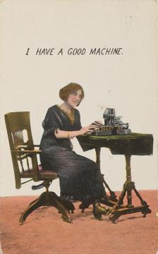 Illustrierte Postkarte; Fotografie, polychrom; Theochrom Serie Nr. 1331 Rückseite: Sekretärin mit Schreibmaschine Oliver Vorderseite: beschrieben; adressiert an Miss Norton, Brooklyn; Poststempel Stoughton/Jun 16 1913