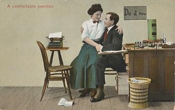 Illustrierte Postkarte; Fotografie, polychrom; Nr. 2326/4 Rückseite: Sekretärin auf Schoß des Vorgesetzten/Mitarbeiters sitzend, daneben kleiner Tisch mit Schreibmaschine Vorderseite: adressiert an Mr. & Mrs. Bruneau, Grand Haven; Briefmarke U.S. Postage One Cent; Poststempel unleserlich