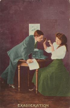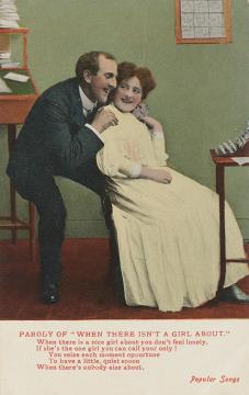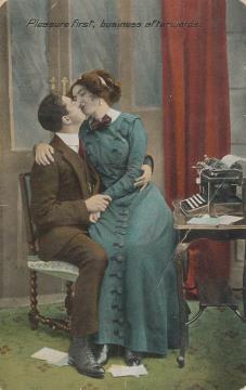 Illustrierte Postkarte; Fotografie, Grafik, polychrom; Serie BS 120 Rückseite: Vorgesetzter und Sekretärin in romantischer Büroszene Vorderseite: beschrieben; adressiert an Miss Ballen, Aberdeen; Briefmarke U.S. Postage One Cent; Poststempel Westport/Jul25 1912