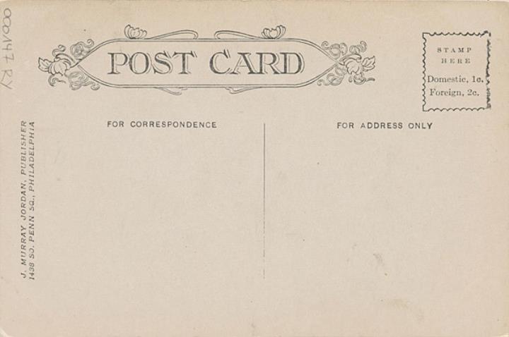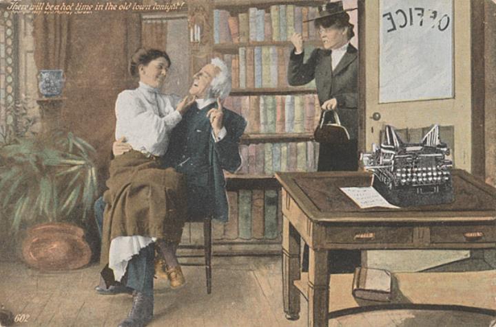 Illustrierte Postkarte; Grafik, polychrom; Nr. 602 copyright 1907 J. Murray Jordan Rückseite: Büroszene; Sekretärin auf Schoß des Vorgesetzten sitzend, Ehefrau betritt das Büro Vorderseite nicht beschrieben