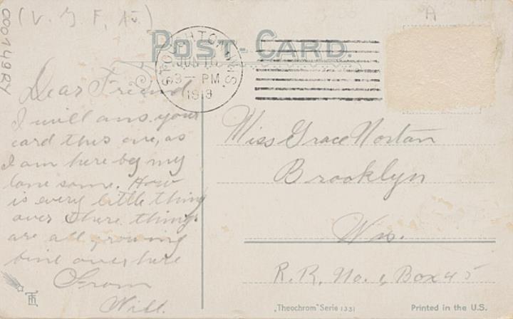Illustrierte Postkarte; Fotografie, polychrom; Theochrom Serie Nr. 1331 Rückseite: Sekretärin mit Schreibmaschine Oliver Vorderseite: beschrieben; adressiert an Miss Norton, Brooklyn; Poststempel Stoughton/Jun 16 1913