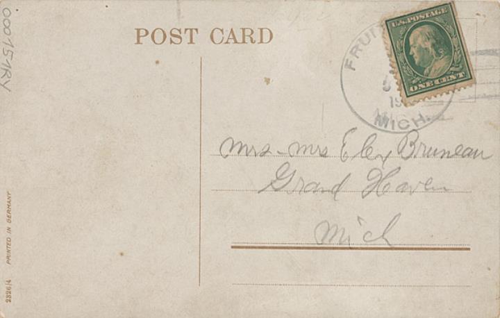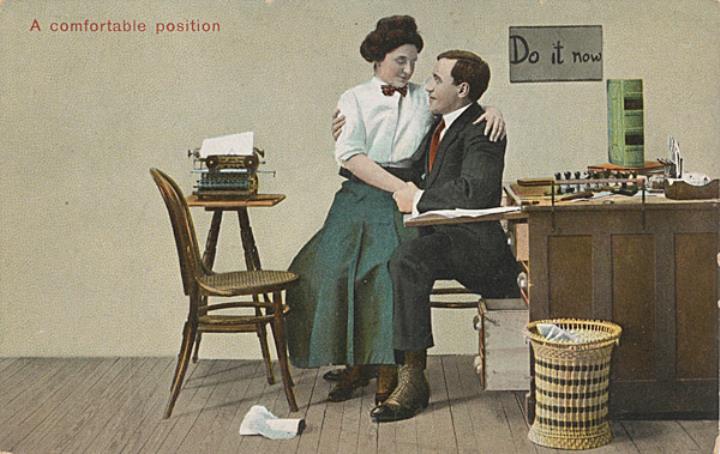 Illustrierte Postkarte; Fotografie, polychrom; Nr. 2326/4 Rückseite: Sekretärin auf Schoß des Vorgesetzten/Mitarbeiters sitzend, daneben kleiner Tisch mit Schreibmaschine Vorderseite: adressiert an Mr. & Mrs. Bruneau, Grand Haven; Briefmarke U.S. Postage One Cent; Poststempel unleserlich