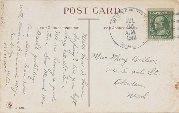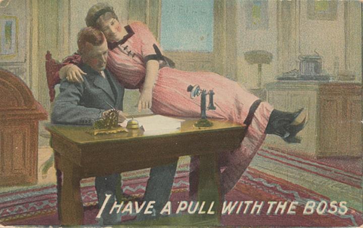 Illustrierte Postkarte; Fotografie, Grafik, polychrom; Serie BS 120 Rückseite: Vorgesetzter und Sekretärin in romantischer Büroszene Vorderseite: beschrieben; adressiert an Miss Ballen, Aberdeen; Briefmarke U.S. Postage One Cent; Poststempel Westport/Jul25 1912