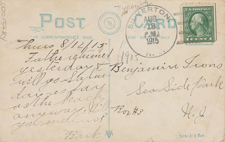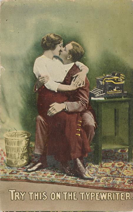 Illustrierte Postkarte; Fotografie, Grafik, polychrom; Serie 3-8 Des. Rückseite: Vorgesetzter/Mitarbeiter und Sekretärin mit Schreibmaschine in romantischer Büroszene Vorderseite: beschrieben; adressiert an B. Irons, Sea Side Park; Briefmarke U.S. Postage 1 Cent; Poststempel Silverton/Aug 13 1915