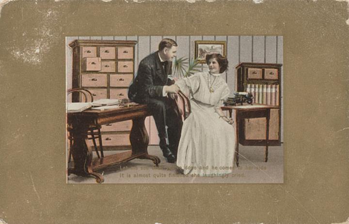 Illustrierte Postkarte; Fotografie, Grafik, polychrom; Theochrom Serie Nr. 1097 Rückseite: Vorgesetzter/Mitarbeiter und Sekretärin in romantischer Büroszene; goldene Umrahmung, Text in Versform Vorderseite: beschrieben, adressiert an Mr. Druhamel, Putnam; Briefmarke U.S. Postage One Cent; Poststempel Jan 6 1909
