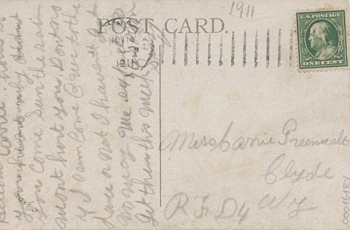 Illustrierte Postkarte; Fotografie, Grafik, polychrom; Theochrom Serie Nr. 1165 Rückseite: Büroszene; Vorgesetzter und Sekretärin beim Vorstellungsgespräch; Text in Versform, goldene Umrahmung Vorderseite: beschrieben und adressiert; Briefmarke U.S. Postage One Cent; Poststempel Nov 14 1911