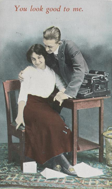 Illustrierte Postkarte; Fotografie, koloriert Rückseite: Vorgesetzter/Mitarbeiter und Sekretärin mit Schreibmaschine in romantischer Büroszene Vorderseite nicht beschrieben