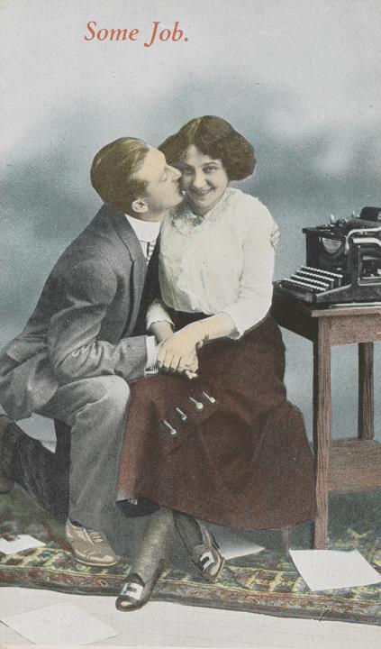 Illustrierte Postkarte; Fotografie, koloriert Rückseite: Vorgesetzter/Mitarbeiter und Sekretärin mit Schreibmaschine in romantischer Büroszene Vorderseite nicht beschrieben