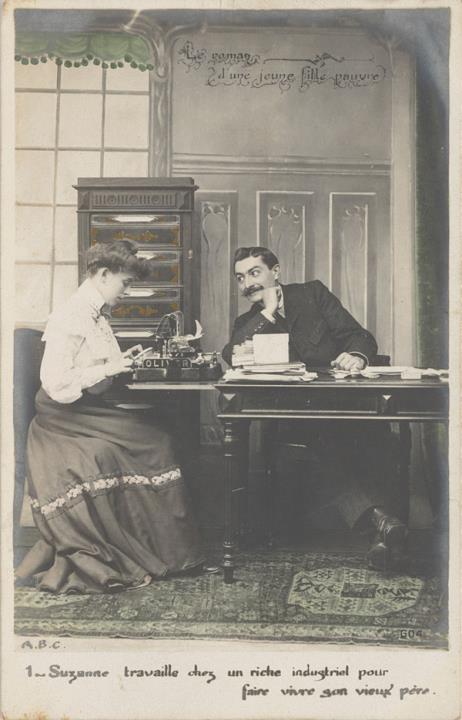 Illustrierte Postkarte; Fotografie, koloriert; Nr. G04 Rückseite: Büroszene; Vorgesetzter und Sekretärin mit Schreibmaschine, darunter Szenentext Vorderseite nicht beschrieben