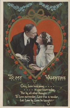 Illustrierte Postkarte; Fotografie, Grafik, polychrom; Serie Nr. 174 Rückseite: Vorgesetzter/Mitarbeiter und Sekretärin mit Schreibmaschine in romantischer Büroszene; Umrahmung in Herzform, darunter Text in Versform Vorderseite: adressiert an Miss Lee; Briefmarke Postage Revenue (U.K.) Half Penny; Poststempel Orediton/Fe 13 191x
