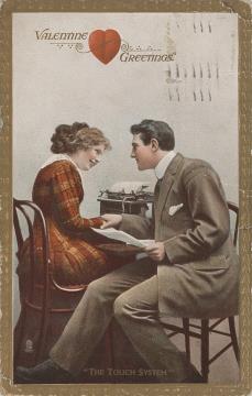 Illustrierte Postkarte; Fotografie, Grafik, polychrom; Serie Nr. 162 Rückseite: Vorgesetzter/Mitarbeiter und Sekretärin mit Schreibmaschine in romantischer Büroszene, Text: The touch system Vorderseite: beschrieben; adressiert an Mr. Nichols, Wales; Poststempel Feb 13 1914