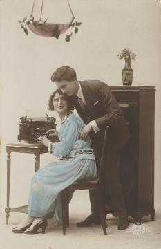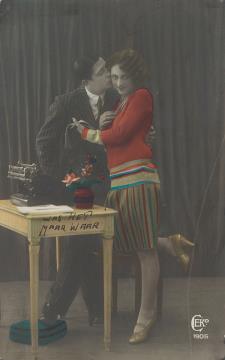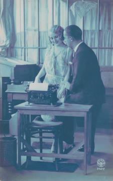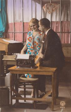 Illustrierte Postkarte; Fotografie, koloriert; Serie Ceko 1905 Rückseite: Vorgesetzter/Mitarbeiter und Sekretärin mit Schreibmaschine in romantischer Büroszene; beschrieben Vorderseite: adressiert; Briefmarke Nederland 1 1/2 cent; Poststempel Ede/22.IX.1931