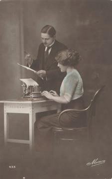 Illustrierte Postkarte; Fotografie, koloriert; Serie Manon 633 Rückseite: Büroszene; Vorgesetzter/Mitarbeiter und Sekretärin mit Schreibmaschine Vorderseite nicht beschrieben