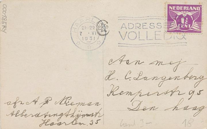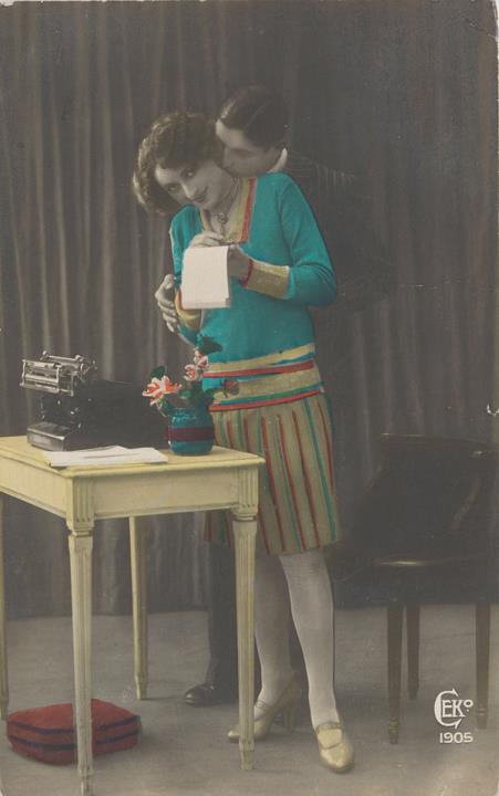 Illustrierte Postkarte; Echt-Fotografie, koloriert; Serie Ceko 1905 Rückseite: Vorgesetzter/Mitarbeiter und Sekretärin mit Schreibmaschine in romantischer Büroszene Vorderseite: beschrieben; adressiert an Mej Langenberg, Den Haag; Briefmarke Nederland 1 1/2 cent; Poststempel Harlem/7 VI 1931