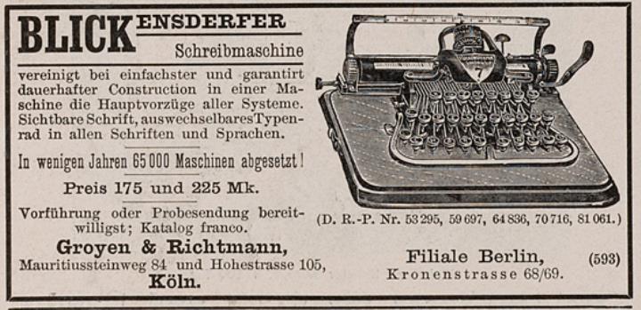Blickensderfer Schreibmaschine. In wenigen Jahren 65000 Maschinen abgesetzt