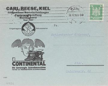 Briefumschlag mit Firmendruck der Bürofachhandlung Carl Reese, Kiel adressiert (Maschinenschrift) an Kohlenkontor Glückauf, Kiel; Briefmarke Deutsches Reich 5 RPf.; Poststempel Kiel/30.6.1926