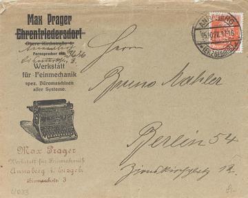 Briefumschlag mit Firmendruck der Reparaturwerkstatt Max Prager, Annaberg adressiert (Handschrift) an Herrn Mahler, Berlin; Briefmarke Deutsches Reich 15 RPf.; Poststempel Annaberg/15.10.1927