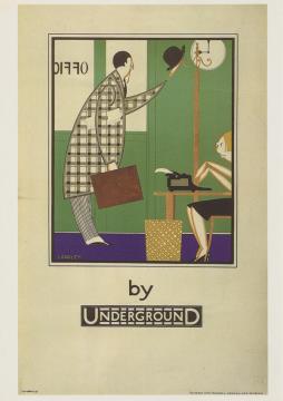 Illustrierte Postkarte; Grafik, polychrom Rückseite: Büroszene; Werbeplakat von Stanislaus Longley (1933) aus dem London Transport Museum Vorderseite nicht beschrieben