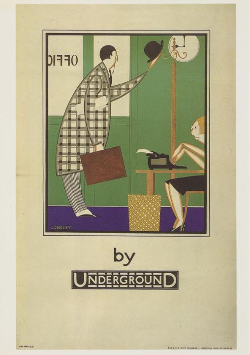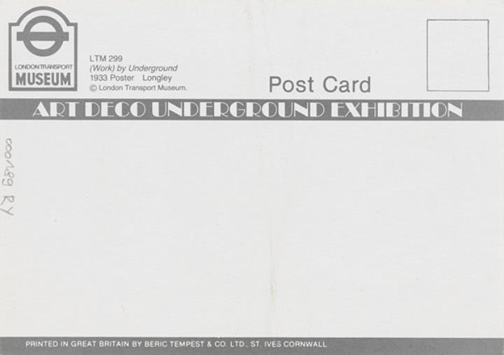 Illustrierte Postkarte; Grafik, polychrom Rückseite: Büroszene; Werbeplakat von Stanislaus Longley (1933) aus dem London Transport Museum Vorderseite nicht beschrieben
