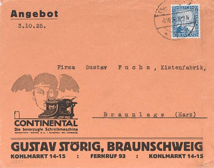 Briefumschlag mit Firmendruck der Schreibmaschinenhandlung Gustav Störig adressiert (Maschinenschrift) an Gustav Fuchs Kistenfabrik, Braunlage; Briefmarke Deutsches Reich 20 RPf.; Poststempel Osnabrück/03.10.25