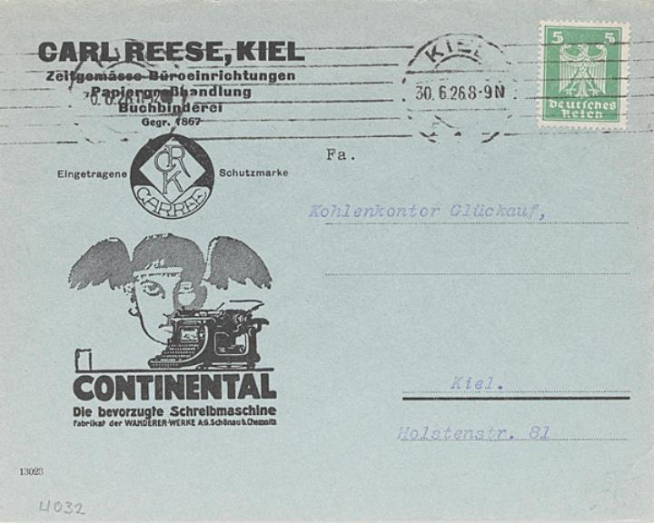 Briefumschlag mit Firmendruck der Bürofachhandlung Carl Reese, Kiel adressiert (Maschinenschrift) an Kohlenkontor Glückauf, Kiel; Briefmarke Deutsches Reich 5 RPf.; Poststempel Kiel/30.6.1926