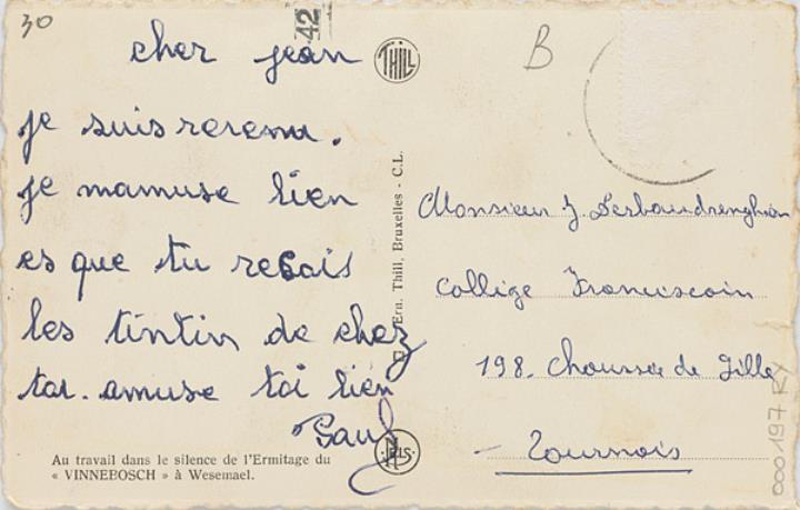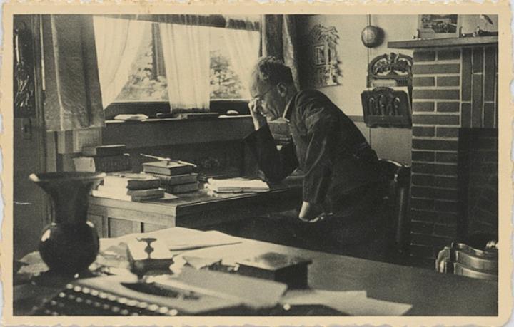 Illustrierte Postkarte; Fotografie, monochrom Rückseite: Arbeitszimmer mit Schreibmaschine; Mann/Geistlicher beim Lesen Vorderseite mit Beschreibungstext: Au travail dans le silence de l'Ermitage du Vinnebosch à Wesemael; beschrieben