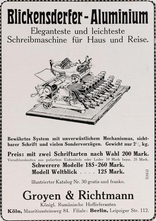 Werbeanzeige für Schreibmaschine Blickensderfer Aluminium; auf Papier geklebt Eleganteste und leichteste Schreibmaschine für Haus und Reise monochrom