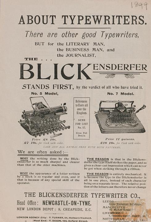 Werbeanzeige für Schreibmaschine Blickensderfer 5 und 7 monochrom