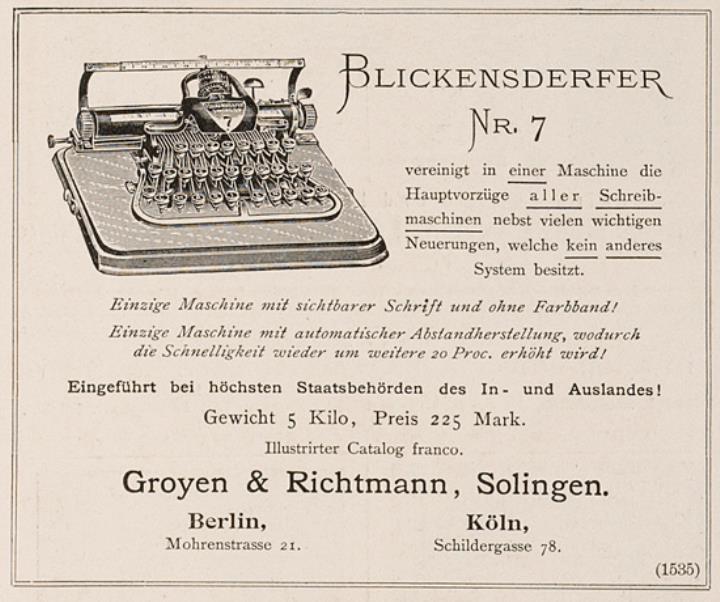 Zeitungsblatt (Illustrirte Zeitung) mit Werbeanzeige für Schreibmaschine Blickensderfer 7 monochrom