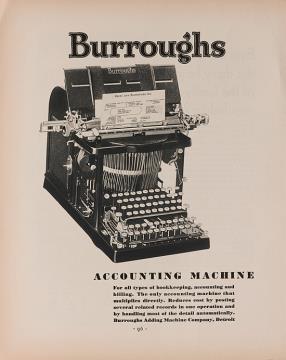 Zeitungsblatt (The Sunday Evening Post) mit Werbeanzeige für Schreib- und Buchungsmaschine Burroughs; mit Passepartout polychrom