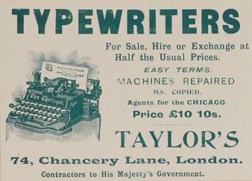 Werbeanzeige für Schreibmaschinenhandlung Taylors Ltd., London und Schreibmaschine Chicago; auf Postkarte geklebt monochrom