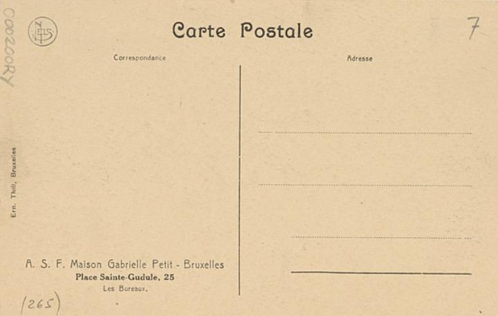 Illustrierte Postkarte; Fotografie, monochrom Rückseite: Büro des Belgischen Frauenverbandes A.S.F.; drei Frauen und Schreibmaschine Vorderseite mit Beschreibungstext: A.S. F. Maison Gabrielle Petit - Bruxelles [...] Les Bureaux