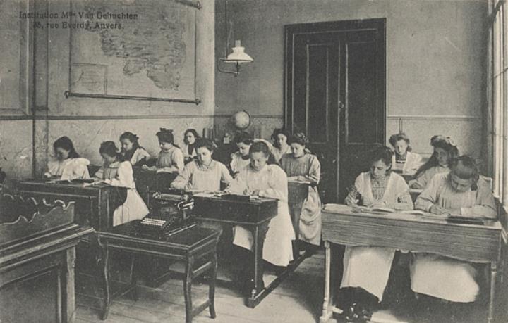 Illustrierte Postkarte; Fotografie, monochrom Rückseite: Unterrichtsraum mit Schülerinnen und Schreibmaschine Vorderseite nicht beschrieben