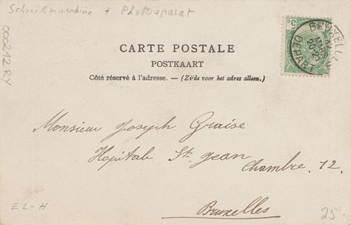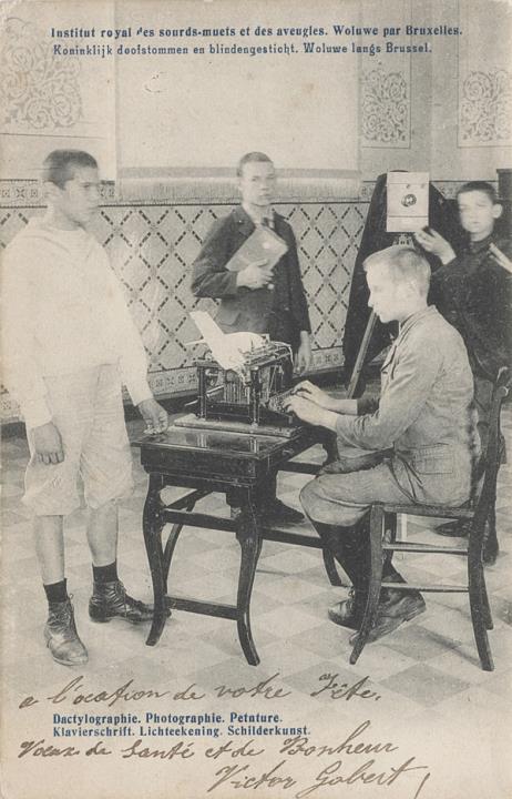Illustrierte Postkarte; Fotografie, monochrom Rückseite: Unterrichtsraum eines Taubstummen- und Blindenheims; Schüler mit Schreibmaschine und Fotoapparat; beschrieben Vorderseite: adressiert; Briefmarke Postes Belgique 5c; Poststempel Bruxelles/17.Mars 20-21