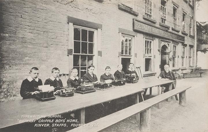 soziale Einrichtung, Mann, Kind, Schreibmaschine, Architektur, Behinderung