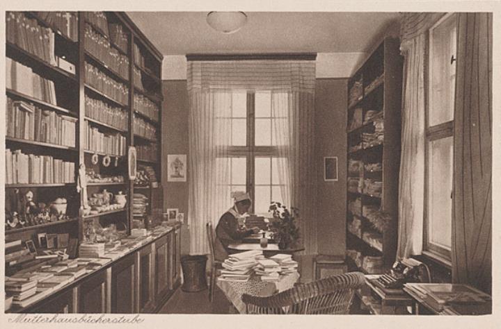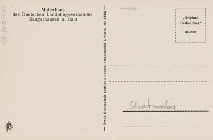Illustrierte Postkarte; Fotografie, monochrom Rückseite: Frau in Uniform (Pflegerin) in einem Bücherzimmer mit Schreibmaschine Vorderseite mit Beschreibungstext: Mutterhaus des Deutschen Landpflegeverbandes Sangerhausen a. Harz