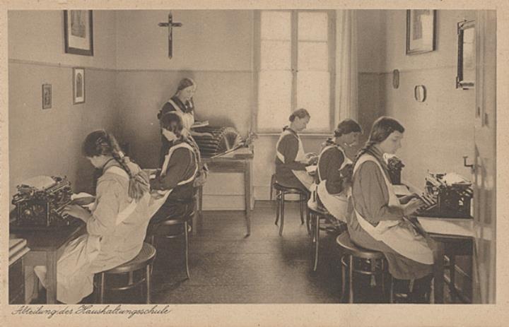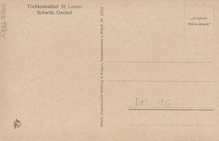 Illustrierte Postkarte; Fotografie, monochrom Rückseite: Unterrichtsraum mit Schülerinnen beim Maschinenschreiben Vorderseite mit Beschreibungstext: Töchterinstitut St. Loreto Schwäb. Gmünd