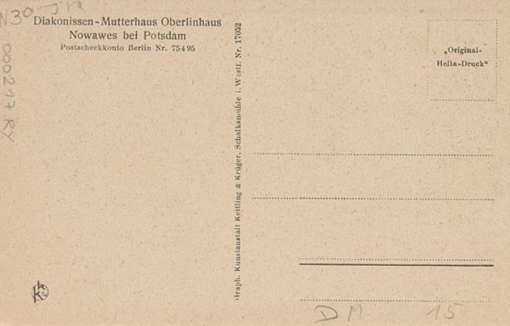 Illustrierte Postkarte; Fotografie, monochrom Rückseite: Bibliothek; zwei Frauen mit Buch in Brailleschrift und Blindenschreibmaschine Vorderseite mit Beschreibungstext: Diakonissen-Mutterhaus Oberlinhausen Nowawes bei Potsdam
