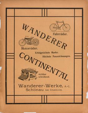Werbeanzeige für Fahr- und Motorräder Wanderer und Schreibmaschine Continental monochrom