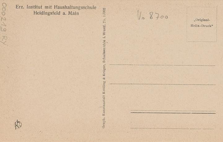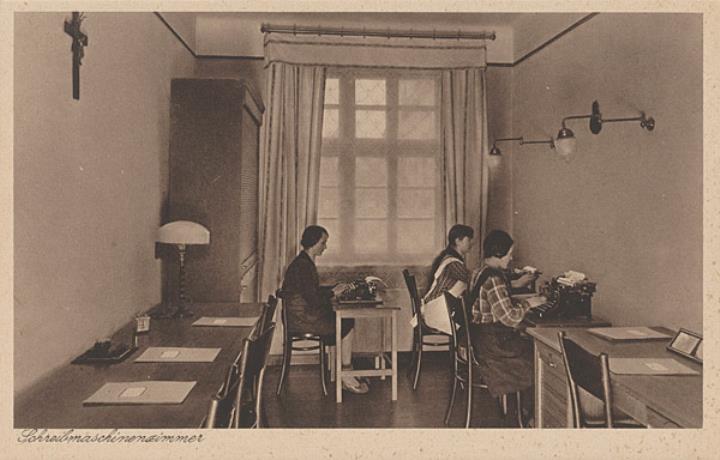 Illustrierte Postkarte; Fotografie, monochrom Rückseite: Unterrichtsraum mit Frauen beim Maschinenschreiben Vorderseite mit Beschreibungstext: Erz. Institut mit Haushaltungsschule Heidingsfeld a. Main