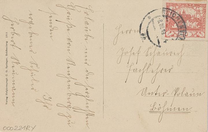 Illustrierte Postkarte; Fotografie, monochrom Rückseite: Unterrichtsraum mit Schreibmaschinen Vorderseite: beschrieben; adressiert an Herrn Schaurich, Unter-Polaun; Briefmarke Posta Slovenska 10; Poststempel Reichenberg/8.III.1919